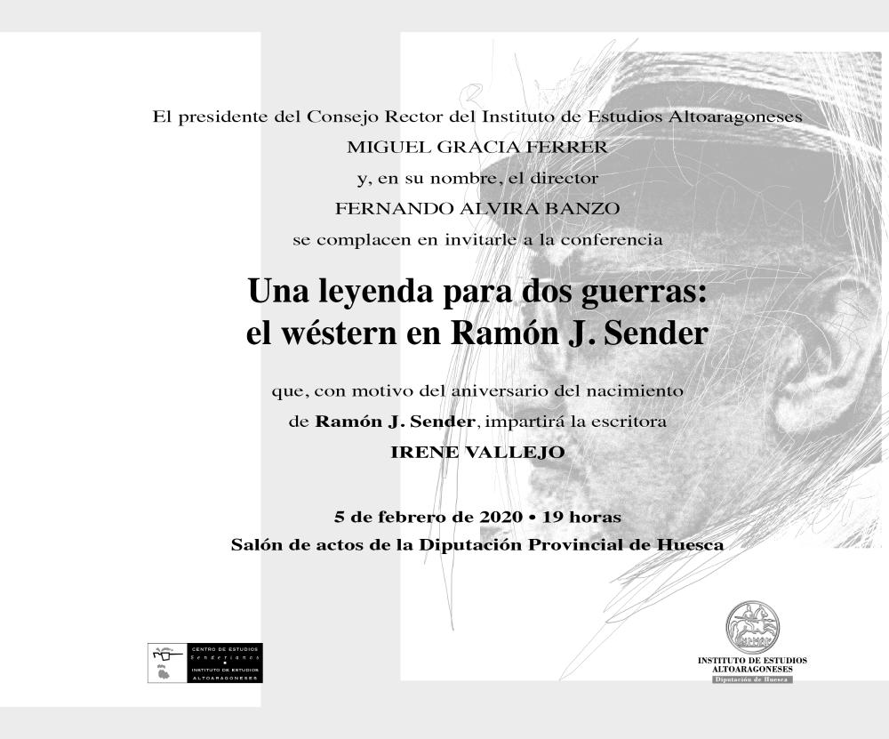 Conferencia Una leyenda para dos guerras: el wéstern en Ramón J. Sender que, con motivo del aniversario del nacimiento de Ramón J. Sender, impartirá la escritora Irene Vallejo.